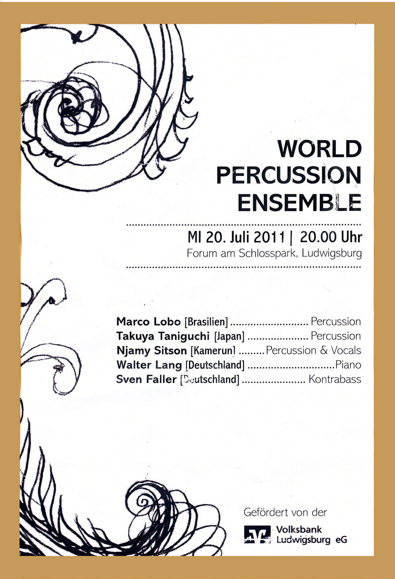 Im WORLD PERCUSSION ENSEMBLE treffen (und trafen gestern) die faszinierendsten Percussion-Traditionen dreier Kontinente aufeinander. Der brasilianische Schlagzeuger Marco Lobo, der Taiko-Trommler Takuya Taniguchi aus Japan  sowie der Sänger und Perkussionist Njamy Sitson aus Kamerun spielen mit dem deutschen Pianisten Walter Lang und dem Bassisten Sven Faller.